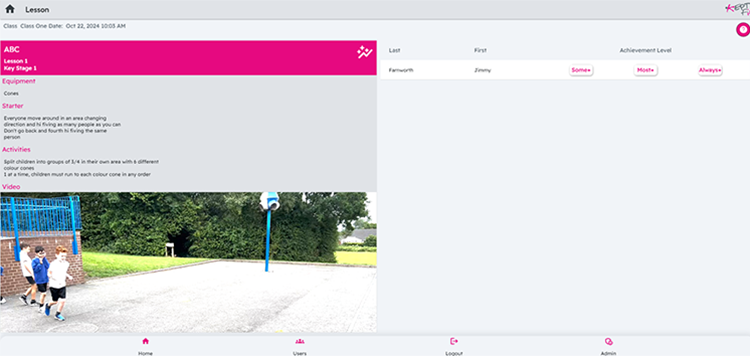 Its easily read on a single page of a tablet as well as allowing teachers to watch the appropriate training video clips and assess pupils as lessons are underway. Pictures can also be taken and linked to classes and activities as well as linking to individual children to aid in reporting.